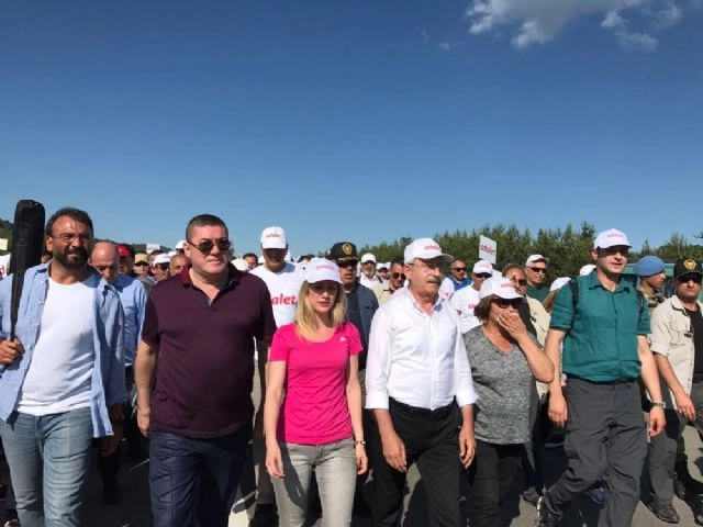 CHP Genel Başkanı Kemal Kılıçdaroğlu, Bolu'da devam eden adalet yürüyüşünün 9. gününün son etabını eşi, oğlu ve geliniyle tamamladı. CHP Genel Başkanı Kemal Kılıçdaroğlu, partisinin İstanbul Milletvekili Enis Berberoğlu'nun tutuklanmasının ardından Ankara'dan başlattığı 'Adalet Yürüyüşü'nün 9'uncu gününü Bolu'da Köroğlu Dinlenme Tesislerinde tamamladı. Kılıdaroğlu'na yürüyüşün son etabında Sözcü Gazetesi yazarı Uğur Dündar, sanatçı Erdal Erzincanlı, Bolu'nun hayırsever işadamı İzzet Baysal'ın yiğeni Ahmet Baysal ve çeşitli meslek gruplarının sivil toplum kuruluşu üye ve yöneticileri eşlik etti. Yürüyüşün bir bölümünde ise faklı dillerde "adalet" yazılı tshirtler giyen vatandaşlarla Kılıçdaroğlu kol kola girerek yürüdüler.Yaklaşık 20 kilometre yürüdükten sonra Bolu'da Köroğlu Dinlenme tesislerine gelen Kılıçdaroğlu'na bir süre eşi, oğlu ve gelini de eşlik etti.(Faruk Çidem /İHA)