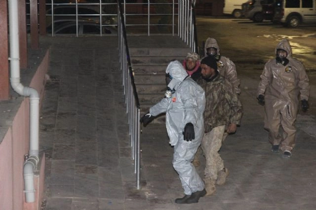 Suriye'nin El Bab bölgesinde kimyasal saldırı şüphesiyle Kilis'e getirilen iki Suriyeli, Kimyasal Biyolojik Radyolojik Nükleer (KBRN) kontrolünden geçiriliyor. Suriye'de kimyasal saldırı şüphesiyle Suriyeli vatandaşlar sınır hattında özel kıyafetli ekipler tarafından alınarak Kilis'teki devlet hastanesinde Kimyasal Biyolojik Radyolojik Nükleer (KBRN) kontrolünden geçirildi. Özel kıyafetli uzmanlar, teknolojik cihazlarla kimyasal ölçüm yaparak Suriyeli hastaları özel ilaçlarla yıkarken, uzmanların ölçümlerinin devam ettiği öğrenildi.(Mehmet Ali Dağ / İHA)