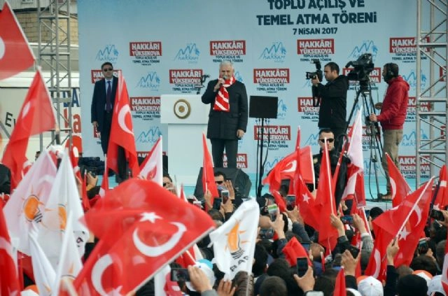 Başbakan Binali Yıldırım, "Bu meydan diyor ki artık bu topraklarda teröre yer yok. Terörden eser kalmayacak. Köklerini kazıyıncaya kadar bu mücadele kararlılıkla devam edecek" dedi. Hakkari'nin Yüksekova ilçesindeki İpekyolu Caddesi üzerinde düzenlenen toplu açılış ve temel atma töreni öncesi vatandaşlar tek tek üst aramasından geçirilerek alana alındı. Halk ellerindeki Türk bayraklarıyla Başbakan Yıldırım'a sevgi gösterisinde bulunurken, güvenlik güçleri ise çevrede geniş güvenlik önlemi aldı. Şırnak'tan helikopterle Selahaddin Eyyübi Havaalanına gelen Başbakan Yıldırım, burada Hakkari Valisi Cüneyit Orhan Toprak ve kurum amirleri tarafından karşılandı. Başbakan Yardımcısı Mehmet Şimşek, Çevre ve Şehircilik Bakanı Mehmet Özhaseki, Gümrük ve Ticaret Bakan Yardımcısı Bülent Tüfenkci ve AK Parti Genel Başkan Yardımcısı Yasin Aktay ile birlikte toplu açılış törenine katılan Yıldırım, her zaman Hakkari'nin desteğini yanlarında gördüklerini belirterek, "Sizden hep güç aldık. Sizden aldığımız bu güçle Türkiye'nin dağ gibi sorunlarını dağ gibi hizmetlere dönüştürdük. Türkiye'nin dört bir yanını imar ettik, imar etmeye devam ediyoruz. Yüksekova'ya 4 bine yakın yeni bir konut yapıyoruz. Yüksekova'yı yeni baştan inşa ediyoruz. İnşallah kardeşlerim, 16 Nisan'da vereceğiniz güçlü, destekle daha çok iş yapacağız, daha çok güçleneceğiz. Türkiye'de demokrasi daha da gelişecek, özgürlükler daha da gelişecek, sizler daha da mutlu hale geleceksiniz. Hakkari, Yüksekova, Şemdinli hazır mıyız? 16 Nisan'a hazır mıyız? İstikrara devam mı? Kardeşliğe evet mi? Sağ olun. Allah sizden razı olsun" dedi."SİYASET MEŞRU ZEMİNDE YAPILIR"Siyasetin meşru zeminde yapıldığını belirten Yıldırım, konuşmasını şöyle sürdürdü:"Siyasetin zeminini kendi kirli amaçları için kullananlar, size hizmet değil ihanet ettiler. Hakkari'de yıllardır zülüm yapan PKK terör örgütünün vereceği hiçbir hizmet yoktur. Kardeşlerim korkmayın, bu alçaklar bir daha sizin kılınıza dokunmayacak. Devletimiz burada, ay yıldızlı bayrağımızın hepimizin başının üstünde yeri var. Gölgesinde bir olarak, beraber olarak yaşamaya devam edeceğiz. Siz de biliyorsunuz hayatı size zehir ettiler. Çukurlarla, hendeklerle binaları yerle bir ettiler. Patlayıcılarla insanlarımızın hayatını yok ettiler. Bunların yaptıklarının ne Kürtlükle, ne Türklük ne de insanlıkla ilgisi var. İşte bataklıktan beslenen o PKK terör örgütü artık devletle milletle arasına giremeyecek, onları çıkarıyoruz aradan. Bundan sonra her işimizi beraber yapacağız. Sorunlarımızı da beraber çözeceğiz, geleceğimizi de beraber inşa edeceğiz."15 Temmuz darbe girişimine de değinen Başbakan Yıldırım, "Devlet içinde devlet olmaya kalkan çeteleri yok etmek boynumuzun borcudur. 15 Temmuz darbe girişiminde millet düşmanlarının maskelerini düşürdük. Sizlerde 15 Temmuz gecesi ay yıldızlı bayrağınızla bu meydanlara indiniz, FETÖ terör örgütüne gereken dersi verdiniz. Bu bayrağı indirtmediniz. Devletle millet arasına bu terör örgütlerinin girmesine asla müsaade edilmeyecek" diye konuştu."ÇOCUKLARIMIZI ÖLÜMÜ GÖNDEREN TERÖR ÖRGÜTLERİ, ZAYIF İKTİDARLARI İYİ KULLANDILAR"Yüksekova'ya havaalanı yapılırken Ulaştırma, Denizcilik ve Haberleşme Bakanı olduğunu hatırlatan Binali Yıldırım, şunları kaydetti:"Ulaştırma Bakanıyken, Yüksekova Havaalanını yapmak için neler çektim. Dozerleri, kamyonları yaktılar. Niye; buraya havalimanı yapılmasın, burası kalkınmasın, buradaki insanlar dünyanın öbür ucuna gitmesin, buraya yatırım gelmesin, biz de bunu kullanarak buradaki insanların geleceğini karartalım, çocuklarını dağlara götürelim, olmadı dükkanlarını kapatalım, haraç alalım. AK Parti öncesini bilmeyen gençler var, onların bilmemesi normal. Eski Türkiye'de ülkeyi yönetenler, vatandaş odaklı siyaset yapmadılar. Koalisyonlarla, krizlerle ülkemiz zaman kaybetti. Çocuklarımızı ölümü gönderen terör örgütleri, zayıf iktidarları iyi kullandılar. Bu topraklarda sizin yaşadığınız bu yerlerde, bu örgütler az zarar vermediler. Onlar için önemli olan siz değildiniz, siz ne kadar mutsuz olursanız onların o kadar işine geliyordu. Annelerin gözyaşları asla onların derdi değildi. Yavrularımızın geleceği, eğitimi, yaşlıların sağlık sorunları onları asla ilgilendirmedi. Kendilerinin de analarına babalarına hiçbir faydası olmadı, ama artık bugünler geride kaldı. İşte Yüksekova meydanı, bu meydan ne diyor? Bu meydan diyor ki artık bu topraklarda teröre yer yok. Terörden eser kalmayacak. Köklerini kazıyıncaya kadar bu mücadele kararlılıkla devam edecek. Türkiye 80 milyon insanıyla artık kol kola, el ele birlikte. Hiç kimse Türkiye'nin insanlarını bir birine düşman edemeyecek.""AZİZ ŞEHİTLERİMİZİ VE ONLARIN YAKINLARININ İNTİKAMINI EN ACI ŞEKİLDE ALACAĞIZ"AK Partili Ahmet Budak'ın öldürülmesi olayına da değinen Yıldırım, "Hakkarili kardeşlerim, Hakkari 1. sıra milletvekili adayımız, kardeşimiz Ahmet Budak'ı çocukları gözlerinin önünde katleden alçaklar bunlar değil mi? Budak'ın 12 yaşındaki oğlu Samet, İbrahim suresinin 47. ayetini taşıdı, 'Allah kimsenin yaptığını yanında bırakmaz.' Çukurca'da havan mermisiyle 5 yaşındaki Viyan Kanat ve 10 yaşındaki Doğan Kanat'ı da katleden bu alçaklar değil mi? Yer ve gök şahit olsun ki şehitlerimizi unutmayacağız, unutturmayacağız. Aziz şehitlerimizi ve onların yakınlarının intikamını en acı şekilde alacağız. Şehitlerimizin, gazilerimizin emanetlerine sahip çıkacağız. Şehitlerimizin, gazilerimizin hesabını bu alçaklardan soracağız. Bu toprakları onlara dar edeceğiz. Bugün Türkiye, artık eski