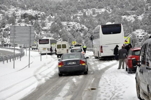 İç Anadolu'yu Akdeniz'e bağlayan Konya-Antalya karayolunda kar yağışı nedeniyle onlarca araç mahsur kalırken, ulaşım da güçlükle sağlanıyor.Konya ve çevresinde etkili olan kar yağışı hayatı olumsuz yönde etkiliyor. Seydişehir-Antalya karayolunda da etkili olan kar yağışı ve buzlanma nedeniyle onlarca araç yolda kaldı. Zor anlar yaşayan sürücüler yol kenarına çektikleri araçlarına zincir takarak ilerlemeye çalıştı. Bölgeye sevk edilen karayolları ekipleri de küreme çalışmaları yaparak yolu trafiğe açmak için çalışmalarını sürdürüyor.(İsmail Sünbül/İHA)