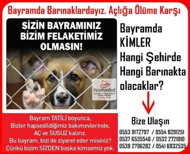 Kurban bayramı tatilinin on gün olması sonucu hayvan barınaklarında görevli personel kalmadığı için binlerce hayvan açlık ve susuzluk tehlikesiyle karşı karşıya. Kurban bayramı tatilinin 10 gün olması sonucu hayvan barınaklarında çalışan veteriner hekimler ve görevli personeller tatile gideceği için binlerce hayvan açlık ve susuzluk tehlikesiyle karşı karşıya kalacak.Yalova Hayvan Hakları Dayanışma Grubu, 10 günlük tatil için hayvanseverlere belediye barınaklarını ziyaret etme çağrısında bulundu. Bayram süresince hayvanları beslemek onlarla ilgilenmek için sosyal medya üzerinden bir arada bulunma çağrısı yapan grup, müslüman bir toplumda hayvanların barınaklarda açlık ve susuzluktan ölmelerinin büyük bir utanç olduğuna dikkat çektiler.Belediye barınaklarında 10 gün boyunca kimsesiz kalacak hayvanlar için vatandaşların bireysel olarak yapacakları ziyaretlerle beraber Yalova Hayvan Hakları Dayanışma Grubu ile bir araya gelerek hayvanların ölümlerine engel olabilirler.