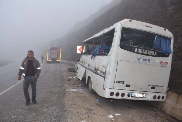 Balıkesir'in Dursunbey ilçesinde maden işçilerini taşıyan minibüs, tomruk yüklü kamyona arkadan çarptı. Kazada 2 maden işçisi öldü, 1'i ağır 24 kişi ise yaralandı.Bursa'nın Harmancık ilçesi ile Balıkesir'in Dursunbey ilçesi arasında sis nedeniyle meydana gelen trafik kazasında 2 kişi öldü, 24 kişi ise yaralandı. Edinilen bilgiye göre, sabah saat 07.30 sularında Pirebeyler kavşağında meydana gelen kazada Asım K. yönetimindeki 55 YD 054 plakalı tomruk yüklü kamyon ile Ramazan K. yönetimindeki 16 KC 130 plakalı işçi dolu minibüs çarpıştı. Kazanın ardından tomruk yüklü kamyondan yola tomruklar savrulurken arkadan gelen Raşit Eyar yönetimindeki 16 CNC 43 plakalı araç, sürücüsünün son anda yaptığı manevrayla tomruklardan kurtulabildi.Kazanın ardından olay yerinde Harmancık, Orhaneli ve Dursunbey'den 112 ekipleri sevk edilirken, yaralılar ambulanslarla hastanelere sevk edildiler. Olay yerine gelen jandarma da yoğun sis sebebi ile farklı kazaların meydana gelmemesi için güvenlik önlemi aldı. Kazada krom üretimi yapan özel bir madende çalışan Sadullah Duman (40) ve Musa Çetin (43) hayatını kaybetti.Kaza sonrası Dursunbey Devlet Hastanesine işçilerin yakınları akın ederken, yaralılardan bazıları yapılan ilk müdahalenin ardından Balıkesir'e sevk edildi. Yaralılar kaza anına ait hiç bir şey hatırlamadıklarını, sadece kamyona vurdukları anı gördüklerini söyledi.Jandarma kaza ile ilgili inceleme başlatırken Dursunbey Cumhuriyet Başsavcısının olay yerinde yaptığı incelemenin ardından cesetler morga kaldırıldı.(Hüdayi Demirhan - Bülent Değirmen / İHA)