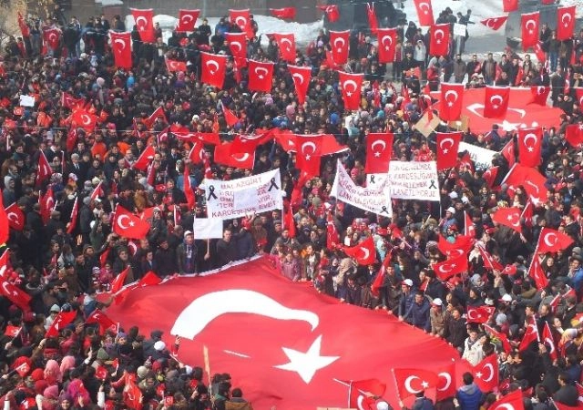 Muş'un Malazgirt ilçesinde düzenlenen 'Teröre Lanet, Kardeşliğe Davet' mitingine binlerce kişi ay yıldızlı bayraklarla katıldı.