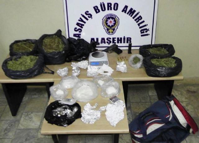 Manisa'nın Alaşehir ilçesinde polis ekiplerinin operasyon düzenledikleri evde piyasa değeri yaklaşık 100 bin TL olan uyuşturucu madde ele geçirdi. Olayla ilgili gözaltına alınan M.Ö. mahkeme tarafından tutuklanırken, eşi R.Ö. ise adli kontrol şartıyla serbest bırakıldı.Alaşehir'de bir ihbarı değerlendiren polis ekipleri planlı bir çalışma sonunda piyasa değeri yaklaşık 100 bin TL olan uyuşturucu maddeyi ele geçirdi. Alaşehir İlçe Emniyet Müdürlüğü, Manisa İl Emniyet Müdürlüğü Kaçakçılık Şubesi Müdürlüğü ekiplerinin işbirliğinde gerçekleştirilen operasyonda M.Ö. (51) isimli şahsın evinde arama yapıldı. Yapılan operasyonda uyuşturucu maddelerle yakalanan M.Ö. ve eşi R.Ö. (49) gözaltına alındı. Dün akşam adliyeye sevk edilen M.Ö. çıkarıldığı mahkemece tutuklanırken, eşi R.Ö. ise adli kontrol şartıyla serbest bırakıldı.Alaşehir Yeni Mahalle'de ikamet eden M.Ö. ve eşi R.Ö.'nün evinde yapılan aramada 14 parça halinde 460 gram 'kristal' diye tabir edilen alüminyum folyoya sarılı fişek ve şeffaf poşetler içerisinde satışa hazır vaziyette Metanfetamin, 51 gram kokain ve türevlerinden oluşan Crak, 7 parça halinde 2 kilo 600 gram esrar maddesi, 1 adet hassas terazi, 1 adet Vizör marka 7,65 çaplı ruhsatsız tabanca, 8 adet 7.65 MKE yapımı fişek ele geçirildi.(Nurettin Doğan/İHA)