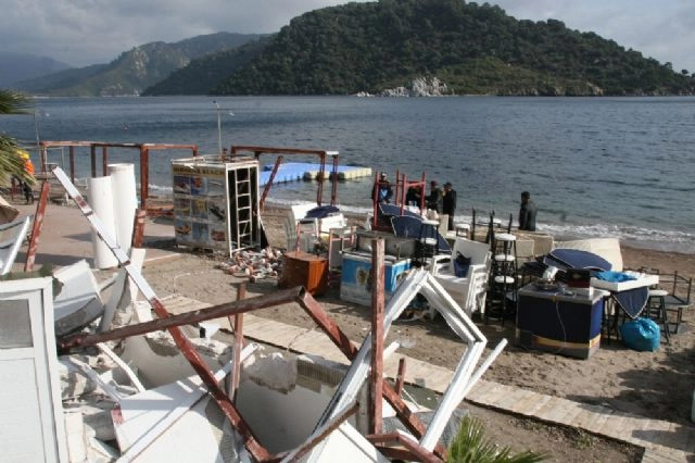 Muğla'nın Marmaris ilçesinde, belediye ekipleri İçmeler sahilinde bulunan ve kaçak olduğu iddia edilen beş kafeteryanın yıkımına başladı.