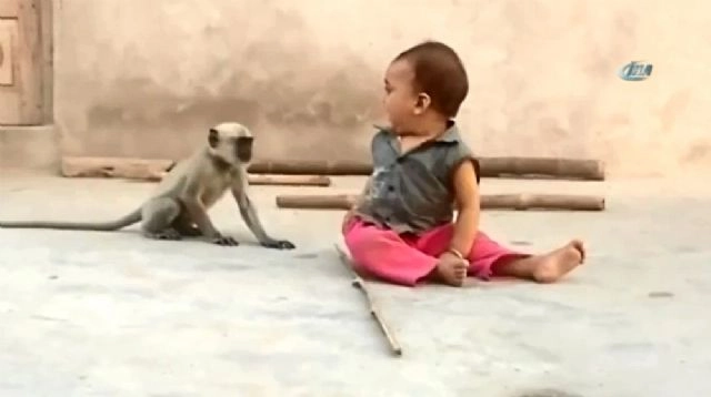 Sevimli maymunun minik çocukla oynamak istediği anlar, izleyenleri güldürdü.Bu sevimli maymun küçük çocukla biraz oynamak istiyor. Hopluyor, zıplıyor. Belirli aralıklarla ona dokunuyor. Ancak küçük çocuk ilk kez maymun görüyor olacak ki biraz korkuyor, ağlıyor. Ancak sevimli maymunu çocuğun ağlaması bile yıldırmıyor. Tekrar tekrar dokunuyor, korkma demek istercesine. Ve olan oluyor. bebek kaçmaya başlıyor..Maymun ise arkadaş olmakta kararlı ancak, başarılı olamıyor. O anlar amatör kameraya işte böyle yansıyor..