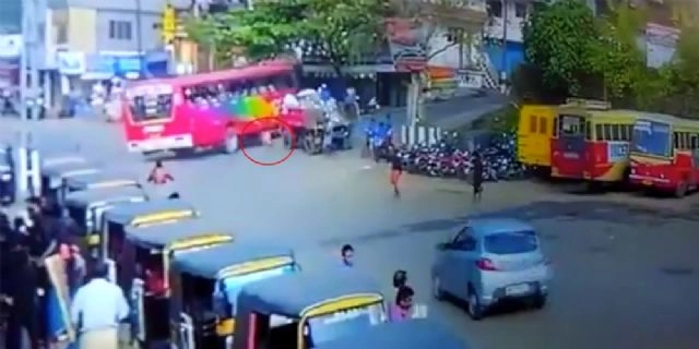 Hindistan'da dönüş yapan bir yolcu otobüsü, motosikleti altına aldı.