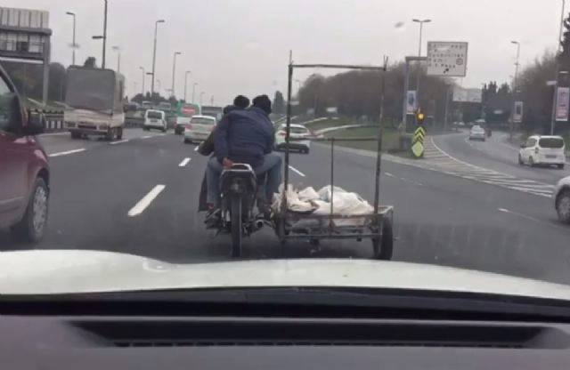 İstanbul'da E5 karayolunda ilerleyen motosiklet sürücüsü yanına bağladığı yük dolu römork ile tehlike saçtı. Trafikte yaşanan o anlar ise başka bir sürücü tarafından saniye saniye görüntülendi. E5 Karayolu Topkapı mevkinde ilerleyen bir motosiklet kullanıcısı, görenleri hayrete düşürdü. Motosiklet sürücüsü, trafikte ilerlerken,yanına bağladığı yük dolu römork ile hem kendi canını, hemde diğer sürücülerin canını tehlikeye soktu. Bu da yetmiyormuş gibi sağ şerit yerine orta şeridi kullanan sürücüye, trafikte olan sürücüler tepki gösterdi.Trafikte yaşanan o anlar ise başka bir sürücü tarafından cep telefonu ile saniye saniye görüntülendi. Görüntülerde, bir motosiklet sürücüsünün yanında bağladığı römork ile ilerlemesi görülüyor.
