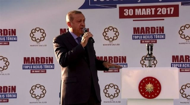 Cumhurbaşkanı Recep Tayyip Erdoğan, "Niçin 'evet' demeniz gerektiğini merak ediyorsanız, dönüp kimlerin 'hayır' dediğine bakın" dedi.Mardin'de toplu açılış töreninde konuşan Erdoğan, "Niçin 'evet' demeniz gerektiğini merak ediyorsanız, dönüp kimlerin 'hayır' dediğine bakın" dedi. Kim 'hayır' diyor, İmralı 'hayır' diyor. Kim 'hayır' diyor, Kandil 'hayır' diyor. Kim 'hayır' diyor, Pensilvanya 'hayır' diyor. Kim 'hayır' diyor, DEAŞ, 'hayır' diyor. Öyleyse, biz istikamet üzereyiz, demek ki doğru yoldayız" diye konuştu.