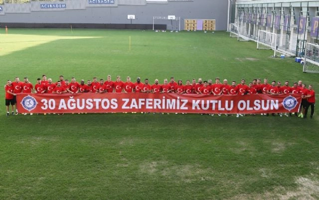 Üç günlük iznin ardından bugün çalışmalara başlayan Osmanlıspor, 30 Ağustos Zafer Bayramı'nı unutmadı. Mor-sarılı ekip, antrenmana ay-yıldızlı tişört ve pankartla çıktı.