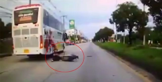 Devrilen motosikletin sürücüsü, otobüsün altında kalmaktan santimetrelerle kurtuldu.Tayland'da trafikte ilerleyen bir motosiklet, önündeki otobüsü geçmek istedi. Bu sırada şeridini ihlal edince de arkadan gelen otomobil motosiklete çarptı. Devrilen motosikletin sürücüsü savrulurken, geçmek istediği otobüsün altında kalmaktan son anda kurtuldu.Tüm yaşananlarsa anbean bir aracın kamerasına yansıdı.