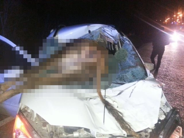 Çankırı'nın Korgun ilçesinde ineğe çarpan otomobildeki 2 kişi yaralandı. Çarpmanın etkisiyle aracın ön camından içeri giren inek ise telef oldu.