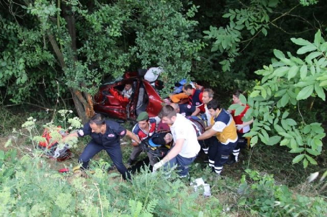 Düzce TEM otoyolu Gölyaka sapağı mevkiinde yoldan çıkan otomobilin ormanlık alana uçması sonucu 2 kişi öldü, 2 kişi yaralandı. Kaza, akşam saatlerinde TEM otoyolu Gölyaka sapağı mevkiinde meydana geldi. Alınan bilgiye göre, İstanbul'dan Ankara istikametine gitmekte olan Bilgin Özbek (58) idaresindeki 45 Z 9160 plakalı otomobil, sürücünün direksiyon hakimiyetini kaybetmesi sonucu yoldan çıkarak ormanlık alana uçtu. Bir ağaca çarpan araçtaki sürücü Bilgin Özbek ile Şengül Özbek (50), Ayfer Altuntepe (48) ve İrem Koca (26) araçta sıkıştı. Olay yerine gelen Düzce Belediyesi itfaiye ekipleri tarafından sıkıştığı yerden çıkarılan Ayfer Altuntepe ve Şengül Özbek'in hayatını kaybettiği belirlenirken, ağır yaralanan Bilgin Özbek ve İrem Koca ise çeşitli hastanelere kaldırıldı. Kaza yapanların Ankara'da bir akrabalarına iftara yetişmeye çalıştıkları öğrenilirken, kazayla ilgili inceleme başlatıldı. (Ali Osman Çatana/İHA)