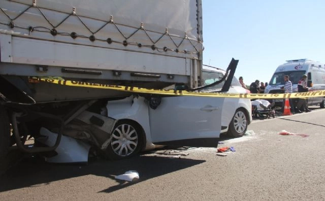 Bolu TEM otoyolunda tıra arkadan çarpan otomobilin sürücüsü hayatını kaybederken, eşi ve çocuğu yaralandı. Kaza, saat 08.30 sıralarında Bolu'nun Yeniçağa ilçesi TEM otoyolu İstanbul istikametinde meydana geldi. Edinilen bilgiye göre, İstanbul istikametine giden Fatih Şahin (37) idaresindeki 34 PE 9045 plakalı otomobil, önünde seyreden Vejdin Talan'ın kullandığı 33 AKN 47 plakalı tıra arkadan çarptı. Çarpmanın şiddetiyle ön kısmı tırın altına giren otomobil, yaklaşık 20 metre tırla birlikte sürüklendi. Kazada otomobil sürücüsü Fatih Şahin olay yerinde hayatını kaybederken, eşi Özlem Keskin Şahin ve 3 yaşındaki kızı Defne Ece Şahin yaralı olarak kurtuldu. Olay yerine gelen sağlık ekibi, yaralı anne ve kızını Abant İzzet Üniversitesi Tıp Fakültesi'ne kaldırdı. Araçta sıkışan Fatih Şahin'in cesedi, Bolu Belediyesi itfaiye ekiplerince sıkıştığı yerden çıkarılarak Gerede Devlet Hastanesi morguna kaldırıldı.Olay yerine gelen cumhuriyet savcısına kazayı anlatan tır sürücüsü Vejdin Talan, "Seyir halindeyken birden gümleme sesi duydum. Lastiğimin patladığını zannederek tırı kenara çektim. Lastikleri kontrol ederken tırın arkasına gittiğimde otomobilin dorsenin altına girdiğini gördüm. Araçta bulunan kadını ve çocuğu çıkarttım" dedi.Jandarma kazayla ilgili inceleme başlattı.(Faruk Çidem / İHA)
