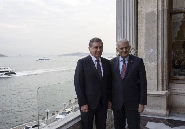 Başbakan Binali Yıldırım, Özbekistan Cumhurbaşkanı Şavkat Mirziyoyev'le ikili görüşmesinin ardından hatıra fotoğrafı çektirdi. Başbakan Binali Yıldırım, Özbekistan Cumhurbaşkanı Şavkat Mirziyoyev'i Çırağan Sarayı'nda ikili bir görüşme gerçekleştirdi. Yapılan görüşmenin ardından Çırağan Sarayı'nın balkonuna çıkan iki lider hatıra fotoğrafı çektirdi. Bu sırada Başbakan Yıldırım Mirziyoyev'e Çamlıca Camii inşaatı ve Bakanlığı döneminde yapılan Marmaray ve Avrasya Tüneli hakkında bilgiler verdi.