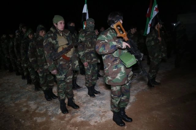 Suriye'nin Azez kentinde Özgür Suriye Ordusu (ÖSO) Afrin operasyonu için hazırlanıyor. Fırat Kalkanı Operasyonu sonrası düzenli orduya geçen ÖSO askerlerinin ellerindeki Türk bayrakları dikkatleri çekiyor.