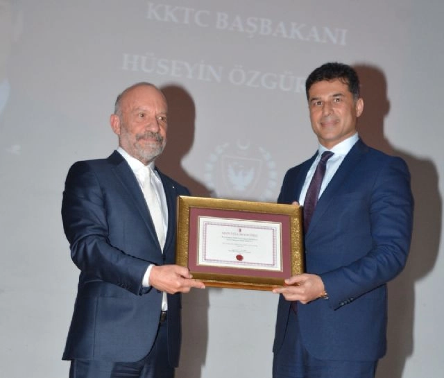 KKTC Başbakanı Hüseyin Özgürgün'e Yakın Doğu Üniversitesi Kurucu Rektörü Dr. Suat İ. Günsel tarafından 'Yakın Doğu Altın Anahtar Onur Ödülü ve Onur Belgesi' takdim edildi.