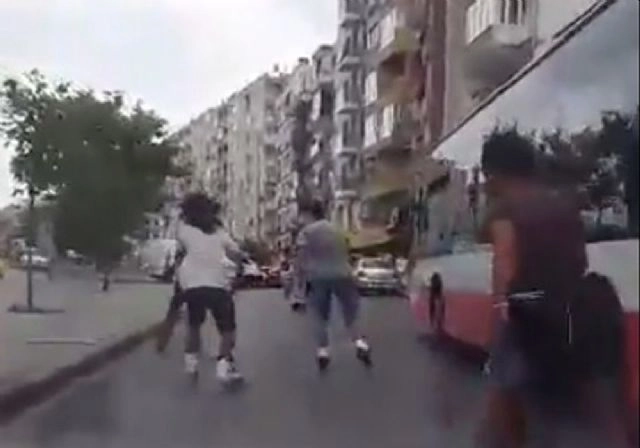 İzmir'de ayaklarındaki patenle yolcu otobüsünün arkasına tutunarak ilerleyen ve her şeyden habersiz adeta ölüme meydan okuyan gençler, izleyenlerin yüreklerini ağza getirdi.