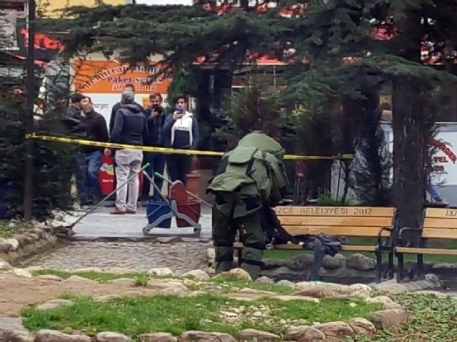 Düzce'de bir parkta unutulan çanta için alarma geçen polis ekipleri çevrede yoğun güvenlik önlemi aldı. Fünye ile patlatılan çantanın patlatılma anını çekmek isteyen vatandaşlar cep telefonlarına sarılıp alana yaklaşınca polis ekipleri kalabalığı uzaklaştırmak için yoğun çaba harcadı.