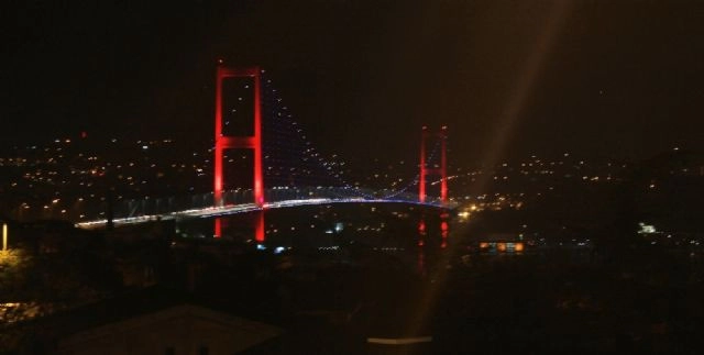 15 Temmuz Şehitler Köprüsü, Avrupa Basketbol Şampiyonu olan Slovenya'nın bayrak renkleriyle ışıklandırıldı.FİBA tarafından düzenlenen 2017 Avrupa Basketbol Şampiyonasının kazananı Sırbistan'ı yenen Slovenya oldu. Sinan Erdem Spor Salonu'nda oynanan final karşılaşmasını Slovenya, Sırbistan'ı 93-85 mağlup ederek kupaya uzandı. Final karşılaşmalarına ev sahipliği yapan Türkiye, şampiyonayı kazanan Slovenya'ya jest yaparak 15 Temmuz Şehitler Köprüsü'nü bayrak renkleri olan kırmızı, mavi ve beyaz renkleriyle ışıklandırdı.(Oğuzcan Yazar / İHA)
