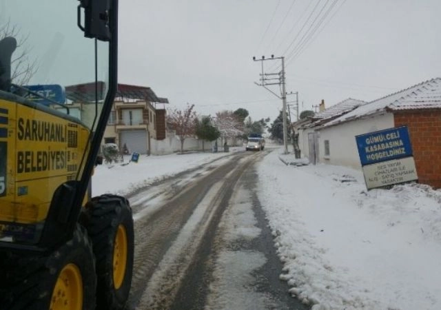 Manisa'nın Saruhanlı ilçesinde yoğun kar yağışı nedeniyle kapanan yollar, Saruhanlı Belediyesi tarafından ulaşıma açıldı.