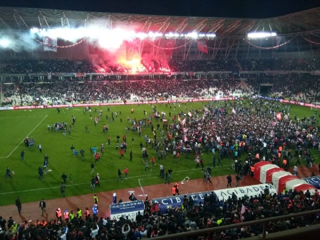 Evkur Yeni Malatyaspor'u evinde 4-0 mağlup eden Sivasspor şampiyonluk sevinci yaşadı. TFF 1. Lig'in son haftasında kendisi gibi geçtiğimiz hafta Süper Ligi garantileyen Evkur Yeni Malatyaspor'u evinde ağırlayan Sivasspor, misafir ekip karşısında 4-0'lık skorla elde ettiği galibiyet ile şampiyon oldu. Maç bitiminde Sivassporlu taraftarlar sahaya girip şampiyonluğu kutladı. Havai fişek gösterisi ve konfetiler ile Yeni 4 Eylül Stadyumu karnaval alanına döndü. Futbolcular şampiyonluk kupasını kaldırarak eğlendi.(Uğur Yiğit / İHA)