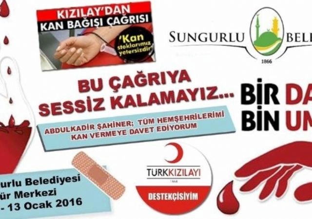 Kan stoklarının azalması üzerine Kızılay'dan gelen çağrıya ,Sungurlu Belediyesi sessiz kalmayarak 'Kan bağışı' kampanyası başlattı.Kızılay'ın kan stokunun azalmasıyla başlatılan kampanya için, Belediye Başkanı ve çalışanları büyük çaba sarf ediyor. Belediye Başkanı Abdulkadir Şahiner, Kızılay tarafından yapılan bu çağrıya ilçe halkının yoğun ilgi göstermesini istedi.Sungurlu Belediye Başkanlığı Kültür Merkezinde 11 Ocak Çarşamba ve 13 Ocak Cuma günleri arasında Türk Kızılayı işbirliği ile düzenlenecek kampanyaya Sungurlu halkını davet eden Başkan Şahiner, yapmış olduğu açıklamada, "Kan stoklarının azalmasıyla Kızılay Genel Başkanının yapmış olduğu çağrıya Sungurlu Belediyesi olarak sessiz kalamazdık. Bu sebeple Kızılay işbirliğiyle ilçemizde kan bağışı kampanyası başlattık. Belediyemiz öncülüğünde başlatılan kampanyanın verimli olacağını düşünüyor,çalışanlarımızın ve Sungurlu halkının kan bağışına yoğun bir ilgi göstereceğine inanıyorum. Belediye çalışanlarımıza ve bu önemli kampanyaya destek olacağına inandığım vatandaşlarıma şimdiden çok teşekkür ediyorum." dedi.