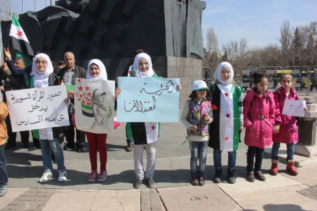Gaziantep'te yaşayan Suriyeli kadınlar, 8 Mart Dünya Kadınlar Günü'nde eylem yaparak, ülkelerindeki Esad rejiminin kadınlara uyguladığı zulme tepki gösterdi.