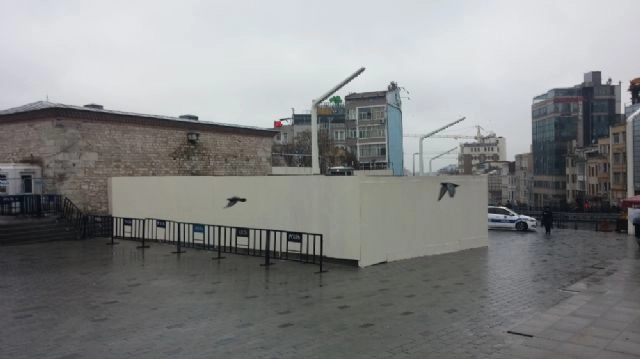 İstanbul'da Taksim Meydanı için İstanbul Kültür Varlıklarını Koruma Bölge Kurulu tarafından onaylanan cami projesine ilişkin çalışmalar hız kazandı. Caminin yapılacağı alanda şantiye kurulumuna bu sabah başlandı.Taksim Meydanı'nda inşa edilecek cami için hazırlıklar başladı. Söz konusu alanda şantiye kurulumuna başlayan ekipler, bölgeyi bariyerlerle çevirdi. Uzun süredir çevik kuvvet polisinin bekleme alanı olarak kullanılan bölgeye konteynerler getirildi. Meydanının Tarlabaşı Bulvarı'na bakan yönünde kurulan şantiye alanında işçilerin hazırlıkları sürerken, şantiye kabinlerinin yerleştirildiği gözlendi. Proje tamamlandığında aynı anda 960 kişi ibadet edebilecek ve projenin yer altında üç katı bulunacak. Otopark olarak tasarlanan üç katta toplam 165 araç park edebilecek.(Alper Korkmaz/İHA)