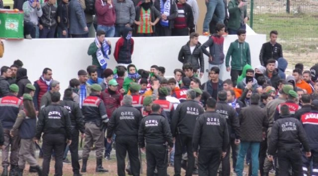 Antalya Süper Amatör Lig Doğu Grubu'nda Manavgat Belediyespor-Kestelspor maçının ardından sahaya inen taraftarları güvenlik güçleri havaya ateş ederek durdurdu.