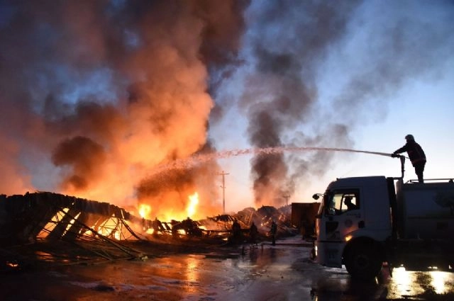 Mersin'in Tarsus İlçesinde Yaş Sebze ve Meyve Hal'inde meydana gelen yangından 18 plastik kasa deposu küle döndü. Alınan bilgiye göre, sabah saat 05.00 sıralarında Hal kompleksi içinde bulunan boş plastik kasaların istiflendiği ve yan yana 18 adet şekilde sıralanmış olan depolarda henüz bilinmeyen nedenle çıkan yangın, bir anda depoların tamamını sardı.Plastik kasaların yanıcı maddeden oluşması ve rüzgarında etkisiyle, sabah karanlığını aydınlatan alevlere Mersin İtfaiye Daire Başkanlığı ekipleri müdahale etti.Yangına 6 itfaiye aracı müdahale ederken, yaklaşık 2 saatlik çalışma sonucu yangın kontrol altına alındı. Yaklaşık 250 bin plastik kasasının olduğu 18 depo küle döndü. Tarsus Yaş Sebze ve Meyve Komisyoncular Derneği Başkanı Mehmet Can, yangın nasıl çıktığı konusunda araştırma yaptıklarını belirtti.(Ersoy Yalçın/İHA)