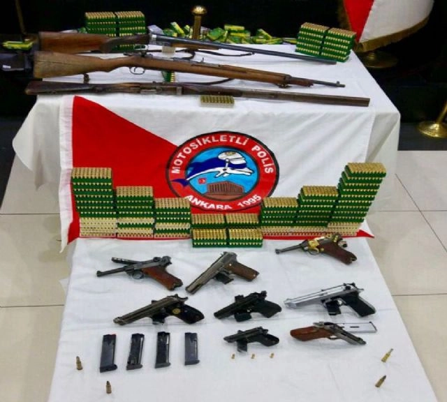 Ankara Asayiş Şube Müdürlüğü Motosikletli Polis Timler Amirliğine bağlı Yunus ekipleri tarafından bir tekel bayisinde yapılan aramada çok sayıda ruhsatsız silah ve dolu fişek ele geçirildi.