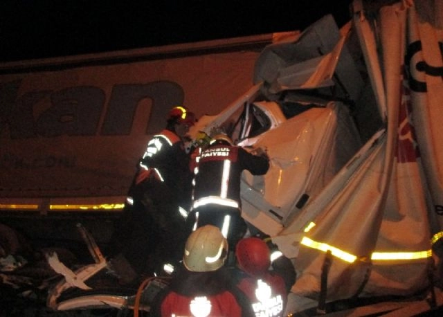 Kurtköy TEM otoyolunda bir kamyon ile iki tırın birbirine girdiği feci kazada 1 kişi hayatını kaybetti, 2 kişi yaralandı. Kaza, saat 20.30 sıralarında TEM otoyolu İstanbul istikameti Kurtköy mevkiinde meydana geldi. İddialara göre, Recep Çakaldaş yönetimindeki kamyon, sürücünün direksiyon hakimiyetini kaybetmesi sonucu önündeki kamyonete çarptı. Çarpmanın etkisiyle kamyonet de önünde seyir halinde olan tıra çarptı. Meydana gelen zincirleme kazada kamyon sürücüsü Çakaldaş ile kamyonetteki iki kişi araçlarında sıkıştı. Çevredeki vatandaşların ihbarı üzerine olay yerine çok sayıda polis, sağlık ve itfaiye ekipleri sevk edildi. Ekipler araçlarında sıkışan yaralıları kurtarmak için yoğun çaba sarf etti. Kamyonetteki 2 kişi sıkıştıkları yerden çıkarılarak ambulansla hastaneye kaldırılırken, Recep Çakaldaş tüm müdahalelere rağmen olay yerinde hayatını kaybetti.Kaza nedeniyle İstanbul istikameti yaklaşık bir saat trafiğe kapalı kaldı. Kapanan otoyolda kilometrelerce araç kuyrukları oluştu.(Metin Başar / İHA)