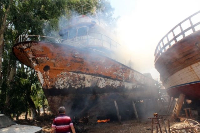 Antalya'nın Manavgat ilçesindeki tersanede saç teknede tamirat yapıldığı sırada yangın çıktı.