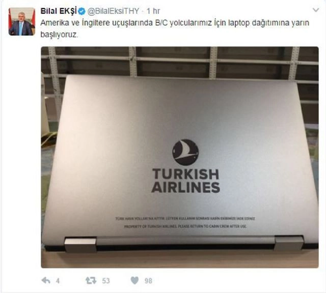 Türk Hava Yolları Genel Müdürü Bilal Ekşi, ABD ve İngiltere için kabin içerisinde başlatılan elektronik cihaz yasağının ardından uçakta dizüstü bilgisayar dağıtma kararının 6 Mayıs itibariyle başlayacağını açıkladı.