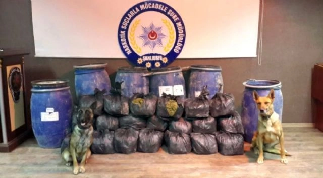 Şanlıurfa'nın Hilvan ilçesinde bidonların içerisinde toprağa gömülü vaziyette 108 kilo esrar maddesi ele geçirildi. Narkotik köpeklerinin yerini tespit ettiği esrar, polisler tarafından kazma ve küreklerle çıkartıldı.