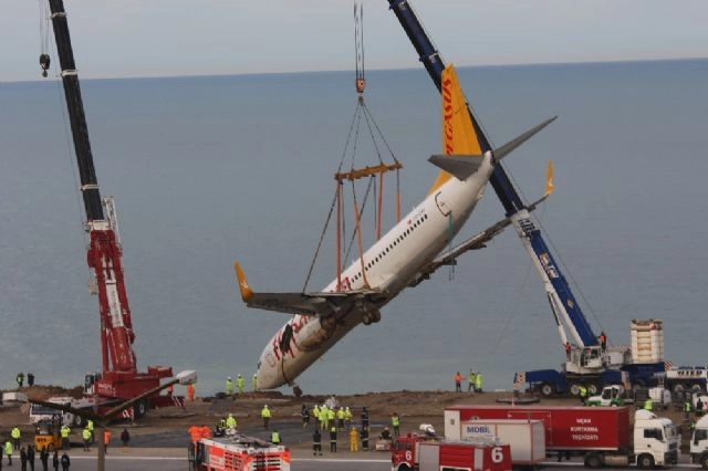 Ankara-Trabzon seferini yaparken Trabzon Havalimanı'na 13 Ocak akşamı indikten sonra pistten çıkan Pegasus Havayolları'na ait yolcu uçağı, bulunduğu yerden vinç yardımı ile çıkartıldı. Uçağın pist üzerine indirilmesi bekleniyor. Pistten çıkan uçak için saat 04:00 sıralarında başlayan kurtarma çalışmaları kapsamında 500 ve 350 tonluk 2 vinç kurulurken, 12 saat süren emeğin ardından uçak bulunduğu yerden çıkartılarak pist üzerine getirildi. Kuyruk, kanat ve burun kısmından halatlarla vince bağlanan uçak yerden metrelerce yukarıda tutulurken, itfaiye araçlarının sıktığı su ile alt bölümü de tamamen çamurdan temizlendi. Bulunduğu yerden alınan uçağın piste indirilmesi bekleniyor. Yaklaşık 100 kişilik bir ekibin katıldığı operasyonda uçağın bir zarar görmemesi ve tek parça halinde bulunduğu yerden çıkartılması için büyük gayret sarf ediliyor.(Ozan Köse - Ersen Küçük - Bekir Koca - Bayram Ali Sarı/İHA)