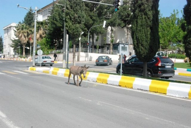 Şanlıurfa'da seyir halindeki araçların arasına dalan eşek yaklaşık 1 saat boyunca sürücülere zor anlar yaşattı. Polisin yoldan aldığı eşek yeniden kaçınca bu defa belediye ekipleri devreye girdi. Edinilen bilgiye göre, Şanlıurfa'nın merkez Haliliye ilçesine bağlı Necmettin Cevheri Caddesi üzerinde bir eşek sürücülere zor anlar yaşattı. Seyir halindeki araçların arasına giren eşeğin önünü kesen iki polis, yoldan almaya çalıştı. Bir bahçeye giren eşek, polislerin bölgeden uzaklaşmasıyla yeniden trafikteki araçların arasına girdi. Yaklaşık bir saat boyunca trafikte sürücülere zor anlar yaşatan eşek, Haliliye Belediyesi ekipleri tarafından yakalandı. Belediye zabıta ekipleri tarafından yakalanarak araca bindirilen eşeğin hayvan barınağına götürüldüğü öğrenildi.(Şinasi İnan/İHA)