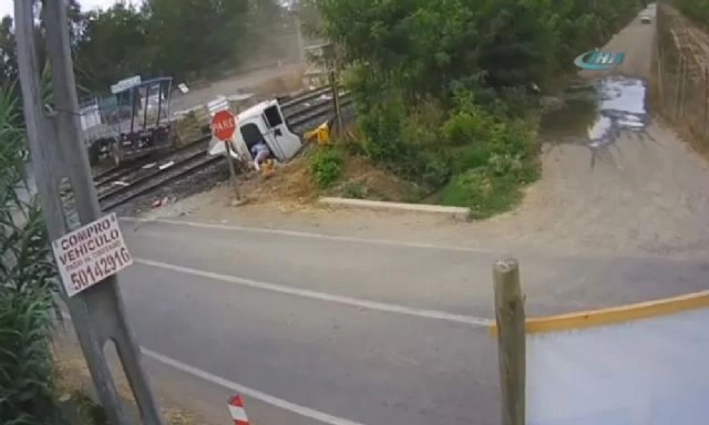 Tren kamyonu böyle biçti. Korkunç kaza Şili'de gerçekleşti. Hemzemin geçitten geçen kamyon sürücüsü dikkatsizliğinin kurbanı oldu. Hızla geren tren, kamyona çarptı. Çarpmanın şiddetiyle kamyon adeta paramparça olurken, ağır yaralanan sürücü kaldırıldığı hastanede hayatını kaybetti.