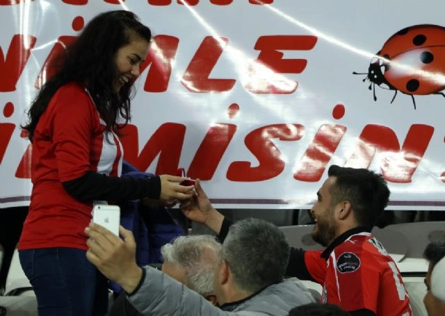 Antalyaspor ile Galatasaray arasında oynan Spor Toto Süper Lig'in 23. hafta kapanış maçından önce kırmızı-beyazlı takımın tribününden bir genç, kız arkadaşına evlenme teklif etti. Tribünde pankart açan ve kız arkadaşına diz çökerek evlenme teklif eden genç 'evet' yanıtını alınca kız arkadaşına uzun süre sarıldı.