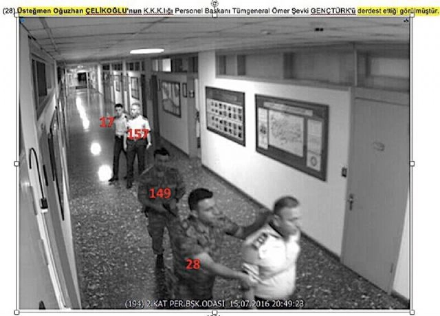 Fetullahçı Terör Örgütü'nün (FETÖ) 15 Temmuz 2016'daki darbe girişimi sırasında darbecilerce derdest edilen dönemin Kara Kuvvetleri Komutanlığı Personel Başkanı Tümgeneral Ömer Şevki Gençtürk'ün Akıncı Üssü'ne götürülme anının görüntüleri dava dosyasına girdi. FETÖ'nün darbe girişimi sırasında Kara Kuvvetleri Komutanlığındaki (KKK) eylemlere ilişkin açılan dava, Ankara 19. Ağır Ceza Mahkemesince görülüyor. Karargahtaki güvenlik kamera kayıtlarını inceleyen bilirkişi heyeti, görüntülerle ilgili incelemelerini tamamladı. Davanın dosyasına giren rapora göre, darbe sanığı eski KKK Geliştirme Daire Başkanı Tuğgeneral Erhan Caha'nın talimatlarıyla hareket eden darbeciler, saat 20.48'de tam teçhizatlı olarak KKK Personel Başkanı Tümgeneral Ömer Şevki Gençtürk'ün odasına girdi. Sanık eski Yarbay Şahin Karatekin, "Sizi Genelkurmay Başkanlığı adına tutukluyorum" dedi ve Gençtürk'ün elleri bağlandı. Darbecilerin derdest edilen Gençtürk'ü odadan çıkarmaları ve turnikeden geçirerek darbe girişiminin komuta merkezi olan Akıncı Üssü'ne götürme anları güvenlik kameralarınca kaydedildi.(Abdullah Sarica/İHA)