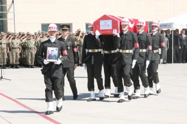 Tunceli'de güvenlik güçleriyle teröristler arasında çıkan çatışmada şehit düşen Astsubay Çavuş Mehmet Yılmaz (24) düzenlenen törenin ardından Ankara'ya uğurlandı. Baba Yusuf Yılmaz, oğlunun naaşı gelirken gözünün yaşını silerek selam durdu.Tunceli'nin Esenyurt Mahallesi kırsalında dün gece PKK'lı teröristlerle güvenlik güçleri arasında çıkan çatışmada Astsubay Çavuş Mehmet Yılmaz şehit olmuş, 2 asker de yaralanmıştı. Şehit Yılmaz'ın naaşı, Fırat Üniversitesi Hastanesinden alınarak tören için Elazığ Havalimanına getirildi. Törene Elazığ Valisi Çetin Oktay Kaldırım, Tunceli Valisi Tuncay Sonel, 8. Kolordu Komutanı Korgeneral Yılmaz Uyar, İl Emniyet Müdürü Doğan Cangül, kamu kurum müdürleri, emniyet ve askeri personel, şehidin babası Yusuf, Annesi Hanım, kardeşi Bekir ve eşi Kübra Yılmaz katıldı.Şehidin naaşının katafalka alınmasının ardından öz geçmişi okundu. Bu sırada baba Yusuf Yılmaz, oğlunun naaşı karşısında selam durdu. İlk görevine Balıkesir'de başladığı belirtilen şehidin yaklaşık bir ay önce Tunceli'ye tayin olarak göreve başladığı belirtildi. "FARE NİTELİĞİNDEKİ O PİSLİKLERE DEVLETİMİZ GEREKEN CEZAYI VERECEK"Acılarının büyük olduğunu ifade eden Tunceli Valisi Tuncay Sonel, "Tarifi mümkün olmayan duygular var içimizde. Bu duyguları anlatmaya kelimeler kifayetsiz kalıyor. Bir ay önce Tunceli ailemize katılan şehidimiz Mehmet Yılmaz'ı dün şehit verdik. İki uzman çavuş kardeşimizde hafif yaralı ve tedavisi sürüyor. Bu topraklar kolay kazanılmadı. Bu topraklar üzerinde dün de bugün de gelecekte de maalesef kirli oyunlar oynanmaktadır. Hiç kimsenin şüphesi olmasın ki devletimiz güçlüdür, azimlidir ve kararlıdır. O dağlarda gezen eşkıyalara, hainlere, kalleşlere ve adeta fare niteliğindeki o pisliklere bu devletimiz gereken cezayı verecektir. Terörlerle mücadelemiz, kahraman askerlerimizle, polislerimizle, devletimizin tüm birimleriyle, Cumhurbaşkanımızın her türlü maddi ve manevi desteği ile üstesinden gelinecektir. Biz buna inanıyoruz" dedi."ALLAH BİZE DE ŞEHADET MERTEBESİ NASİP ETİSİN"Terör örgütleriyle mücadelenin sürdüğünü aktaran Vali Sonel, "Devletimizin güçlü ve azimli kararlılığı ile bunların başı ezilecektir ve ezilmektedir. Birlik ve beraberlikle bu terörün başını ezmek için yemin ediyoruz. Allah bize de şehadet mertebesi nasip etsin" diye konuştu.Vali Sonel'in konuşmasının ardından İl Müftüsü Yusuf Sarıkaya dua etti. Daha sonra şehidin naaşı askerler tarafından omuzlara alınarak uçağa götürüldü. Şehidin ailesi de gözyaşı içinde, protokol üyelerinin desteği ile uçağa bindi. Aslen Kırıkkaleli olan şehit Yılmaz'ın naaşı Ankara'ya götürüldü.(Kamil Cankılıç-Ahmet Mücahid Kantarcıoğlu/İHA)