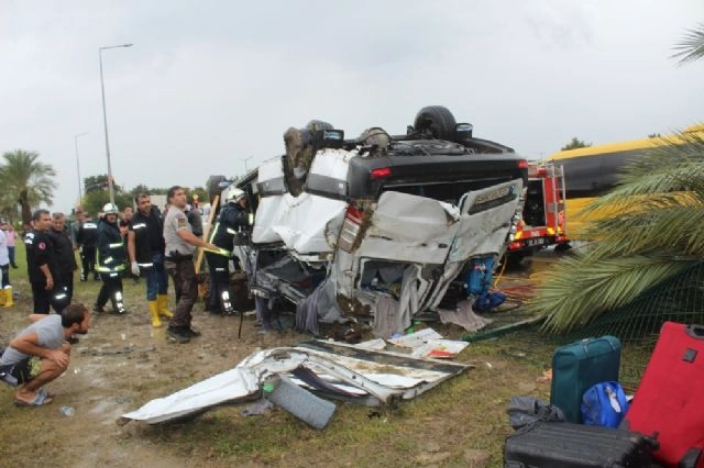 Antalya'nın Manavgat ilçesinde Alman turistleri taşıyan tur minibüsünün kayganlaşan yolda kontrolden çıkıp refüje çarptıktan sonra devrildiği kazada 3 kişi öldü, 1'i ağır 11 kişi de yaralandı. Edinilen bilgiye göre, Ömer A., yönetimindeki 02 DB 595 plakalı tur minibüsü, Antalya Havalimanından aldığı 13 Alman turistle Manavgat ilçesi Çolaklı kavşağı yakınında yağışın da etkisiyle kayganlaşan yolda direksiyon kontrolünü yitirdi. Savrulan minibüs ters dönerek refüjdeki palmiye ağacına çarptıktan sonra devrildi. Kazaya ilk müdahaleyi yoldaki sürücüler yaparken, olay yerine çok sayıda itfaiye, jandarma ve ambulans sevk edildi. Kaza yerine ulaşan Antalya Büyükşehir Belediyesi İtfaiye kurtarma ekipleri aracı keserek yaralıları çıkarırken, sağlık ekipleri ilk müdahaleyi yaptıktan sonra 1'i ağır 11 yaralıyı Manavgat'taki çeşitli hastanelere sevk etti. Yaralananlardan birinin 1 yaşında olduğu belirtildi. Kazada Alman turistler Heike Mendler, Heike Fauth ve Frank Fauth hayatını kaybetti. Ölenlerin cenazeleri kaza yerinde yapılan inceleme sonucu otopsi için Manavgat Devlet Hastanesi morguna götürüldü.Kazada yaralanan rehber Mahmut Ertuğrul, Britta Buch ve Ute Stöbel Geb Kurz, Eslem Hastanesinde Michael Höner, Tanja Höner ve Emily Höner Bilgi Hastanesine, Heike Bessert ve Meike Bunze Anadolu Hastanesine, Heike Berrerich, Alexander Berrerich ve Jörg Manfred Reinhard Yaşam Hastanesinde tedavi altına alındı.Minibüs sürücüsü Ömer A., jandarma tarafından gözaltına alınarak karakola götürüldü.Refüjdeki minibüs ise çekici ile kaza yerinden kaldırıldı(Arif Kaplan/İHA)