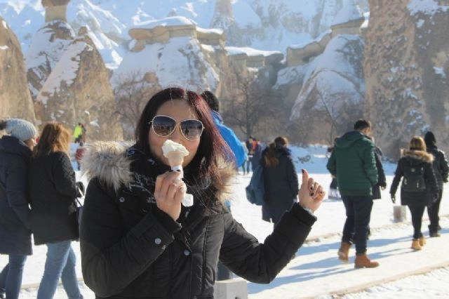 Türkiye'nin en önemli turizm merkezlerinden biri olan Kapadokya'da aşırı soğuklara aldırış etmeden dondurma yiyen Uzakdoğulu turistler dikkatlerden kaçmadı.Türkiye'nin en önemli turizm merkezlerinden biri olan Kapadokya bölgesini özellikle kış mevsiminde Uzakdoğulu turistlerin tercih etmesi; bölge turizmcilerini sevindirdiği kadar dondurma satıcılarının da yüzlerini güldürüyor. Nevşehir'in Avanos ilçesine bağlı Paşabağları mevkiini ziyaret eden Uzakdoğulu turistler, hava sıcaklığının -15 olmasına aldırış etmeden kış ayında dondurma yemenin keyfini yaşıyor. 15 yaşında ki Wietnamlı Doung Zun, "Havalar çok soğuk. Ama buna rağmen dondurma çok güzel ve lezzetli. Benim için çok güzel bir deneyim oldu." dedi.Paşabağlarında dondurma satışı yapan Emrah Kumru ise, "Kış sezonunda dondurma satışlarımız durgun. Ama Uzakdoğulu turistler bölgede olduğu için biraz onlar dondurmaya rağbet gösteriyor. Türk dondurmasını çok seviyorlar. Keçi sütünün ne kadar lezzetli olduğunu dondurma yiyerek öğreniyorlar." şeklinde konuştu.(Coşkun Sağlamdin / İHA)