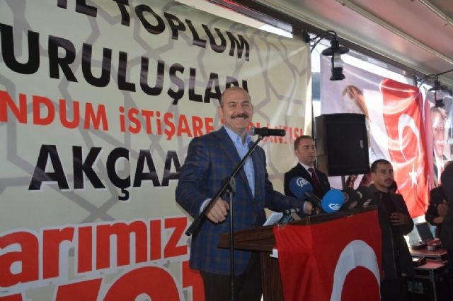 İçişleri Bakanı Süleyman Soylu, "Türkiye artık sineklerle uğraşmamalı, bataklığı kurutmalıdır, o yüzden güçlü olmalıdır. Bir sistem sorgulaması yapmalıdır" dedi.Sabah saatlerinde Ankara'dan havayolu ile Trabzon'a gelen İçişleri Bakanı Süleyman Soylu, Akçaabat ilçesinde partililer, STK ve oda temsilcileri ile Referandum İstişare Toplantısı'nda buluştu. Toplantıda konuşan Bakan Süleyman Soylu, "15 Temmuz sonrasında artık konuşulması gereken bir tek mesele vardır artık siyaset ağzındaki baklayı çıkarmalıdır. Türkiye artık sineklerle uğraşmamalı, artık bataklığı kurutmalıdır. Güzel vatanımız artık bir muhasebe yapmalıdır. 27 Mayısı, yıllarca üzüntü gününü bayram olarak kutlatanların neyi murad ettiğini tartışmalıdır. Türkiye neden her büyük yatırım hamlesi sonrasında siyasete yapılan gayrimeşru uygulamaları konuşmalıdır. Birlik ve beraberlik anlamında elde ettiğimiz bütün kazanımları nasıl 10 yılda bir yapılan müdahalelerle kaybettiğini konuşmalıdır. Bir sistem sorgulaması yapmalıdır. Bu sorgulamaları rejim kavgalarını bir yana bırakarak yapmalıdır. Ayağına vurulan prangaları tartışmalıdır.Türkiye'de neden cuntacıların 10 ayda yaptığı anayasadan 35 yılda neden kurtulamadığını sorgulamalıdır. Bu millet 67 senedir akıntıya karşı kürek çekmektedir" diye konuştu."TÜRKİYE'NİN ANAYASA DENEYİMİ, KURUCU ANAYASA HARİCİ TAMAMI SUNİDİR""15 Temmuz 2016 gecesi bir hadise yaşandı" diyen Soylu "ABD'de yaşayan kime uşaklık ettiği malum olan bir meczubun aklına uyan bir grup hain darbeye kalkıştı. O gece TRT'de bir bildiri okundu. Allaha şükür milletimizle beraber çok geçmeden müdahale edildi. O bildirinin sonunda bir vaat vardı. Neydi hatırlıyormusunuz; yeni bir anayasa. Herkes unuttu. O bildiride yeni bir anayasayı Türkiye'ye getirmeyi, millete deklare etmeyi kendilerine bir vazife etmişlerdi. Bu darbe girişimi başarılı olsaydı 2016 yılında bir darbe anayasası olacaktı. Bununla 2002'den beri atılan bütün adımlar bu karanlık idare ile uçup gidecek kardeş kavgası bu ülkede her zaman sahaya sürülecekti. Türkiye'nin anayasa deneyimi kurucu anayasa harici tamamı sunidir" ifadelerini kullandı.Soylu, Türkiye'nin artık arkasına dönmekten yorulduğunu belirterek "Artık hedefimize, istikametimize bakmak istiyoruz. Her 10 yılda bir bu millete diyorlar ki 'Bu ülkeyi size idare ettirmeyeceğiz, yönettirmeyeceğiz.' Millet de her seçimde bunlara sandıkları patlatarak darbe yapıyor. Her gün patronumuzu değiştiriyorlar. Bir gün anayasa mahkemesi yapıyorlar , bir gün patronumuzu Yargıtay, bir gün Danıştay yapıyorlar. Bir gün sermayede ülkemizi istedikleri gibi yönetmek isteyenler bizi faizin esiri haline getirmek isteyenleri patron yapıyorlar. Bir gün IMF'yi bize patron yapıyorlar. Bir gün medya, medya patronlarını patron yapıyorlar. Her şeyimize, değerlerimize ayar veriyorlar. Milletimizi parçalamak ve bu ülkenin değerlerini bir şekilde zayıflatmak için bize patronluk taslıyorlar. Biz de haykırıyoruz patron siz değilsiniz patron milletir, millettir, millettir" şeklinde konuştu."ERTUĞRUL ÖZKÖK SENİN DİLİN ÇOK UZAMIŞ"İçişleri Bakanı Süleyman Soylu, konuşmasında gazeteci ve köşe yazarı Ertuğrul Özkök'e yönelik de eleştirilerde bulunarak şunları söyledi:"Ertuğrul Özkök sana söylüyorum. Senin dilin çok uzamış. Sayın başkanımıza laf ediyorsun, dilin çok uzamış. Senin kimlerin sözcülüğünü yaptığını çok iyi biliyoruz. Çok net ve açık şekilde söylüyorum. Sen bu ülkenin tarihini bilmiyorsun. Bilmediğin işlere karışma. Bu ülkede Menderesi Başbakan yapmamak için milleti sıra dayağından geçirdiler. Recep Tayyip Erdoğan'ı başbakan yapmamak için hapislere attılar. Bilmediğin işlere karışma. Edepsizliğin yeri yoktur. Kimlerle birlikte olacaksan, git onlarla beraber ol. Yazıklar olsun. Hangi ızdırabı, hangi sıkıntıyı çektin ? Sırçalı köşklerde oturdun bu millete hakaret ettin. 15 temmuzda hiç beğenmediğiniz, kokusunu duymayayım diye yüzünüzü çevirdiğiniz bu aziz millet sayesinde ayaktasınız. Sakın ha bri daha sesini çıkarma. Yazını yazacaksan yaz, sözlerini ortaya koy. Edepsizlik yapma. Bu ülkenin hangi sorununa merhem oldunuz. Oturduğunuz sırça köşklerde viskilerini yudumladınız, bu millete hakaret ettiniz. Bu milletin sabrını zorlamayın.""Bu sistem devam etsin diyenlere söylüyorum" diyerek sistem değişikliği istemeyenlere seslenen Soylu " 7 Haziran'da PKK sözcüsü HDP'nin ortaya koyduğu o anlayışı hep birlikte endişe ile izledik. Nasıl olsa tek başına iktidar yok, koalisyon olacaktı. 'Birine çelme atarım, istediğim gibi Türkiye'yi idare ederim' diye düşünüyorlardı. 'İstediğim gibi yönetirim, istediğim gibi peşkeş çekerim',tam kıvamına gelmişlerdi. Bir şeye kadar geldiler. PKK'yı devreye soktular. Varto'da, Cizre'de, Nusaybin'de her yerde devreye soktular. 'Özerlik ilan ediyoruz' dediler. Endişeye kapıldılar. Bizi zayıf yakaladılar, kolumuzu bükmeye çalıştılar. Bu milleti iyi tanımıyorlardı. Şimdi söylüyoruz, oralarda geziyoruz, her şeyi ortaya koyuyoruz, hadi yüreğiniz yetiyorsa, bugün özerklik edin de görelim sizi" dedi.Soylu "AK Parti siyaseti kutuplaştırıyor diyorlar" diyenlere de cevap olarak "AK Parti siyaseti yüzde 34 ile başladı bugün 50'nin üzerinde. Nasıl aldı bu 16 puanı. Dayatarak mı aldı? Yollarla mı? Şehir hastaneleriyle mi? Yoksa uzaya uydu fırlatmayla mı ? Milleti dağıtarak mı aldı. Darbe ile mi aldı ? ihtilalle mi aldı ? 34'den 50'nin üzerine gelirken ben dahil olmak üzere bu çatıda herkese kucak açtı" ifadelerini kullandı.CHP Genel Başkanı Kemal Kıılçdaroğlu'nun bir radyo programında yeni sisteme yönelik eleştirilerini hatırlatan Soylu "Kılıçdaroğlu'nu ta