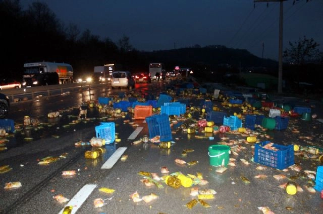 Yalova-Bursa yolunun Süpürgelik rampasında kontrolden çıkan turşu yüklü kamyon kontrolden çıkarak devrildi. Kazada kamyon kasasında bulunan tonlarca turşu yola saçıldı.Bursa istikametinden Yalova istikametine giden İ.K (35) yönetimindeki 34-FA-6998 plakalı kamyon, süpürgelik mevkiinde kontrolden çıkarak önce çelik bariyerlere çarptı sonra devrildi. Kamyonun kasasında bulunan tonlarca turşu, kazanın etkisiyle yola saçıldı. Kazayı yara almadan atlatan araç şoförü kazayı korku içerisinde anlattı. Yolun kaygan olduğunu dile getiren şoför, "Neredeyse araçtan atlayacaktım" dedi. Kaza sonrasında yola saçılan turşular nedeniyle kapanan yolda 2 kilometrelik araç kuyruğu oluştu. Yalova İtfaiyesi ekipleri tarafından yolun tazyikli su ile yıkanması sonrasında araçların geçişine izin verildi.(Saim Çotuk / İHA)