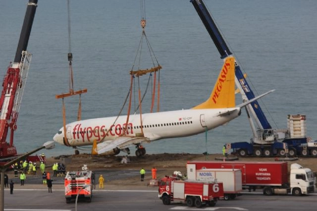 Ankara-Trabzon seferini yaparken Trabzon Havalimanı'na 13 Ocak akşamı indikten sonra pistten çıkan Pegasus Havayolları'na ait yolcu uçağı bulunduğu yerden vinç yardımı ile çıkartılarak pist kenarına alındı. Pistten çıkan uçak için saat 04:00 sıralarında başlayan kurtarma çalışmaları kapsamında 500 ve 350 tonluk 2 vinç kurulurken, 12 saat süren emeğin ardından uçak bulunduğu yerden çıkartılarak pist üzerine getirildi. Kuyruk, kanat ve burun kısmından halatlarla vince bağlanan uçak yerden metrelerce yukarıda tutulurken, itfaiye araçlarının sıktığı su ile alt bölümü de tamamen çamurdan temizlendi. Bulunduğu yerden alınan uçak pist kenarındaki toprak zemine indirilirken, uçağın kazadan ötürü zarar gören sağ kanadına bir ağırlıkla destek sağlanacağı ardından uzun araç üzerine konularak güvenli bölgeye çekileceği kaydedildi.