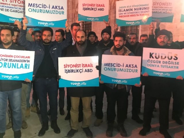 ABD'nin Kudüs'ü İsrail'in başkenti kabul etmesinin ardından Bursa'da vatandaşlar sabah namazından sonra Ulucami'de eylem yaptı. Bursa'da çok sayıda kişi, Amerika'nın Kudüs kararına tepki göstermek için tarihi Ulucami'de toplandı. Sabah namazının ardından Ulucami bahçesinde basın açıklaması yapan TÜGVA Bursa İl Başkan Yardımcısı Mehmet İstemihan, "Bugün günlerden 7 Kasım 2017. Bugün ümmetin diriliş şuurunun toparlandığı, ümmet gençliğinin her imkanlarla zalimlere baş kaldırdığı bir gün. Bu sabah ümmetin şanlı durduğu şanlı tarihlerine gebe olan gecenin sabahlarından bir gün. Yıl 2 Kasım 1948, Hazreti Nebi'den, Hazreti Ömer'den, Selahattin'den Yavuz Sultan Selim'den itibaren hep aynı oyunlarla, kalleşlikler başladı. Türkiye ve dünyadaki tüm Müslüman gençlik olarak diyoruz ki yenileceksiniz ve güçsüz kalacaksınız. Ulucami bizim şahidimiz olsun ki artık hiçbir gün eskisi gibi olmayacak. Bizler tarih sahnesinden silmeyi büyük bir heyecanla arzu ettiğimiz o kutlu günün Amerika'nın ve İsrail'in yeryüzünden silindiği günü büyük bir aşkla ve heyecanla bekliyoruz. Amerika'nin dün gece yaptığı açıklamaların bizler için herhangi bir kıymeti harbiyesi yoktur. Tüm bu olanlar bizlerin cihad ve yeniden dirilme ruh kökünü hareketlendiren gelişmelerdir Filistin halkı bilsin ki Osmanlı'nin torunları onları yalnız bırakmayacak. Abdulhamid'in torunları onlar yalnız bırakmayacak Bursa halkı kardeş mübarek şehir Kudus'u asla ama asla yalnız bırakmayacaktır" dedi.Kalabalık grup açıklamanın ardından dağıldı.(Yusuf Ali Arslan/İHA)
