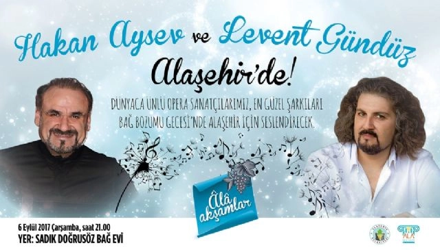 Üzümün başkenti Alaşehir'in Bağ Bozumu Gecesi ilginç bir gösteriye ev sahipliği yapacak. Alaşehir'in üzüm bağlarında opera sanatçıları Hakan Aysev ve Levent Gündüz'ün vereceği konserde şair ve yazar Sunay Akın da benzersiz anlatımıyla farklı bir gösteriye imza atmaya hazırlanıyor.
