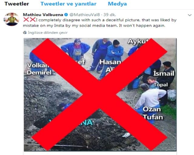 Fenerbahçe'nin yıldız oyuncusu Mathieu Valbuena, Instagram hesabındaki beğeniyle ilgili açıklama yaptı.Takımda sorumluluk alan tek ismin Valbuena olduğunu anlatan kompozisyonlu 'belediye işçileri' caps'inin Fransız oyuncusu tarafından beğenilmesi gündeme oturdu. Bunun üzerine bir açıklama yapan Fransız oyuncu, "Insta ve sosyal medya ekibim bu aldatıcı resmi yanlışlıkla beğenmiş. Ben buna tamamen karşıyım. Bir daha olmayacak"' dedi.